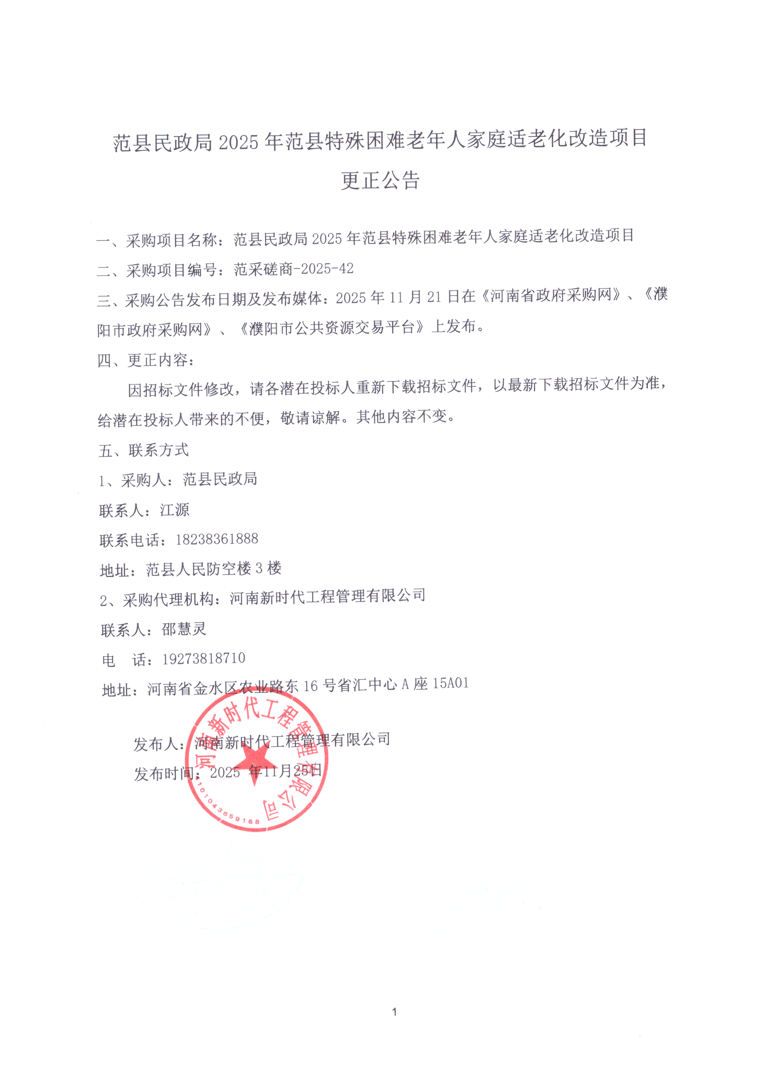 | 2、原公告的采购项目名称:范县民政局2025年范县特殊困难老年人家庭适老化改造项目 |