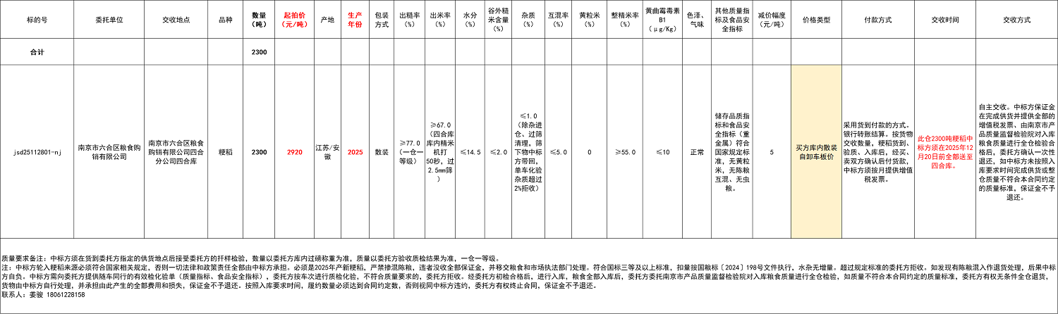 2.交收方式:买卖双方自主交收,中标方凭盖章合同和身份证明到委托方交货。此仓2300吨粳稻中标方须在2025年12月20日前全部送至委托方四合库。如遇不可抗力(雨雪季、台风等)经双方协商解决。按照入库要求时间,履约数量必须达到合同约定数,否则视同中标方违约,委托方有权终止合同,保证金不予退还。